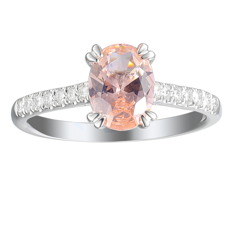 טבעת יהלומים דגם R11058\DW הכי מיוחדת בצורת אבן אובלית, אבן מרכזית צבעונית אבן מורגנייט ורוד עתיק ובצידי הטבעת של האבן המרכזית יש שיבוץ של יהלומים . טבעת יהלומים זהב לבן 14 קראט משובצת באמצע באבן מורגנייט 1.02 קראט ובצדדים יהלומים שהסה"כ 0.15 קראט .