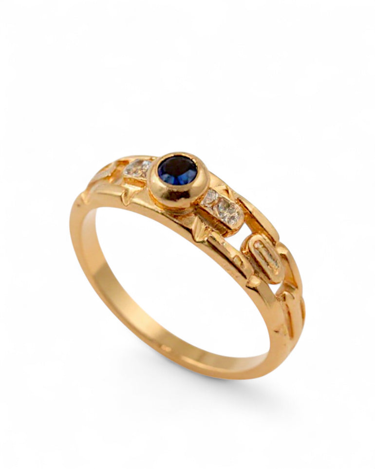 טבעת בעיצוב וינטג' ייחודי עם שיבוץ מרכזי של אבן חן עגולה בצבע כחול כהה בתוך תושבת עגולה סגורה. משני צידי האבן משובצים זירקונים קטנים בגימור מדויק, וביניהם משתלבים דגמים גאומטריים בעבודת חריטת לייזר, היוצרים מראה עשיר ומלא אופי. מתאימה לנשים שמתחברות לעיצובי רטרו בעלי נוכחות.