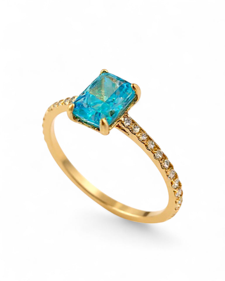 טבעת אלגנטית ומעודנת עם אבן חן מרכזית בגוון טורקיז בגזרה מלבנית, משובצת בתושבת פתוחה עם ארבע שיניים זהובות. גוף הטבעת מעוטר בשיבוץ עדין של אבני חן קטנות לאורך החישוק, מה שמוסיף ברק עדין וניצוץ מכל זווית. השילוב בין האבן המרכזית הבוהקת לגוף הזהב הנקי יוצר איזון ייחודי בין צבע עז למראה קלאסי.