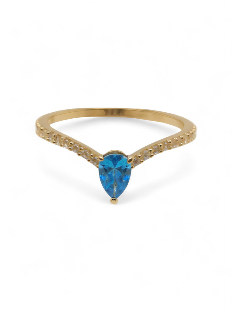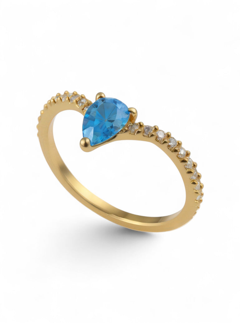טבעת זהב בעיצוב אלגנטי ועדין, משובצת אבן מרכזית כחולה בחיתוך טיפה, הממוקמת במרכז החישוק ומודגשת בשיבוץ זירקונים קטנים לאורך הזרועות. הזהב הצהוב 14 קראט בגימור מבריק יוצר ניגוד יוקרתי המבליט את הגוון העז של האבן המרכזית ומעניק לטבעת מראה נשי ומעודן, המתאים הן לשימוש יומיומי והן לאירועים מיוחדים.