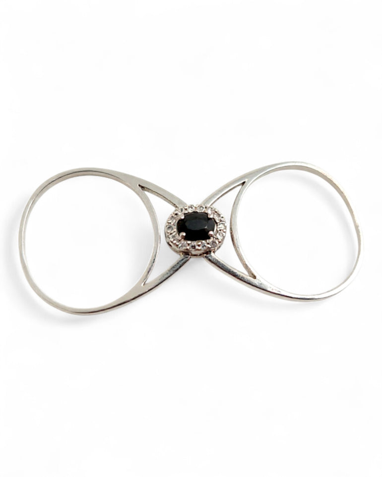 טבעת זהב כפולה ומיוחדת במינה, בעיצוב מתהפך דו-צדדי: בצדה האחד משובצת אבן אובלית שקופה מוקפת בזירקונים מנצנצים, ובצדה השני – אבן אובלית שחורה עם מסגרת זהה. שני החישוקים מעניקים אחיזה נוחה לשתי אצבעות, ובמרכזם מנגנון סיבוב ייחודי המאפשר להפוך את הטבעת לפי מצב הרוח או ההופעה. השיבוץ המדויק והמבנה האלגנטי יוצרים מראה מתוחכם ונועז גם יחד.