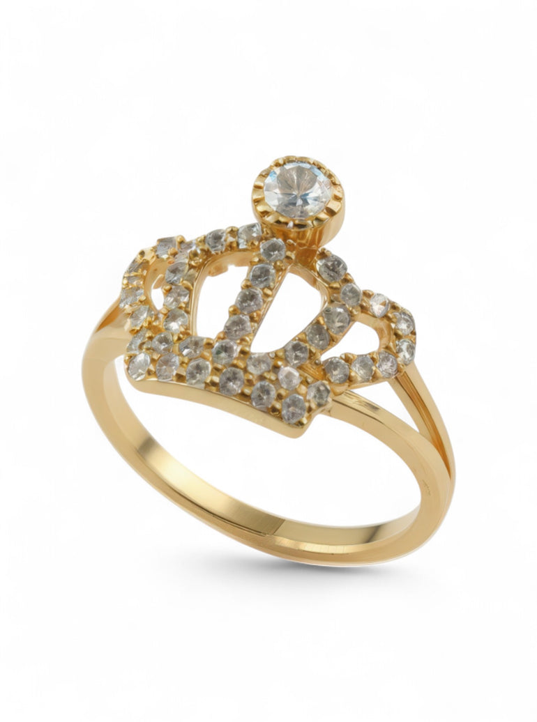 טבעת זהב ייחודית בעיצוב כתר פתוח ומעוטר, המשדר יוקרה ונוכחות. גוף הכתר משובץ זירקונים בוהקים לכל אורכו, ובמרכז העליון משובצת אבן זירקון עגולה גדולה, המוסיפה מיקוד וברק מרהיב לעיצוב. טבעת זו משלבת בין עוצמת הסמליות של הכתר לבין יופיים הקלאסי של אבני הזירקון, ויוצרת תכשיט אלגנטי ונשי המתאים לכל אירוע.