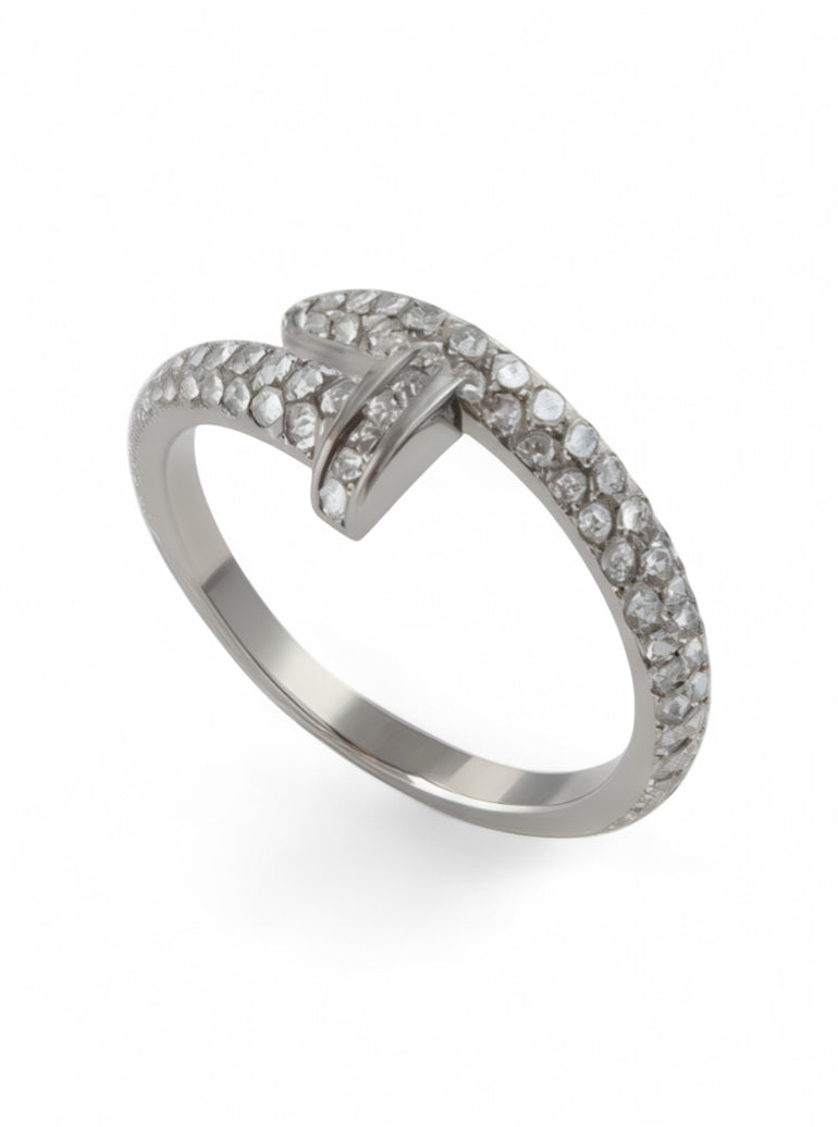 טבעת ייחודית בעיצוב מסמר פתוח ומודרני, עשויה זהב לבן 14 קראט ומשובצת לכל אורכה בזירקונים בוהקים בשיבוץ מוקפד. במרכז העיצוב – חיבור אלגנטי המדגיש את הקו המתעקל של הטבעת ומעניק לה מראה עוצמתי אך מלא אלגנטיות. השיבוץ הצפוף מוסיף ברק מרהיב ומראה יוקרתי, ההופך אותה לפריט מושלם לאירועים מיוחדים וגם לשימוש יומיומי בסגנון מוקפד.