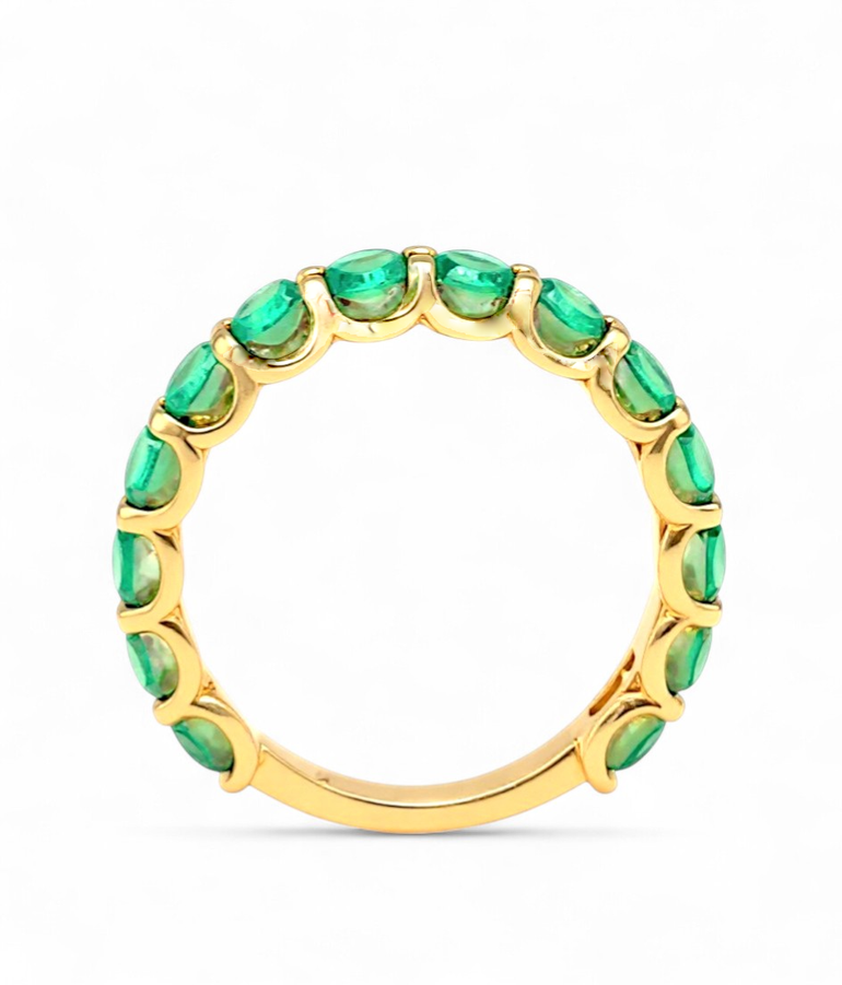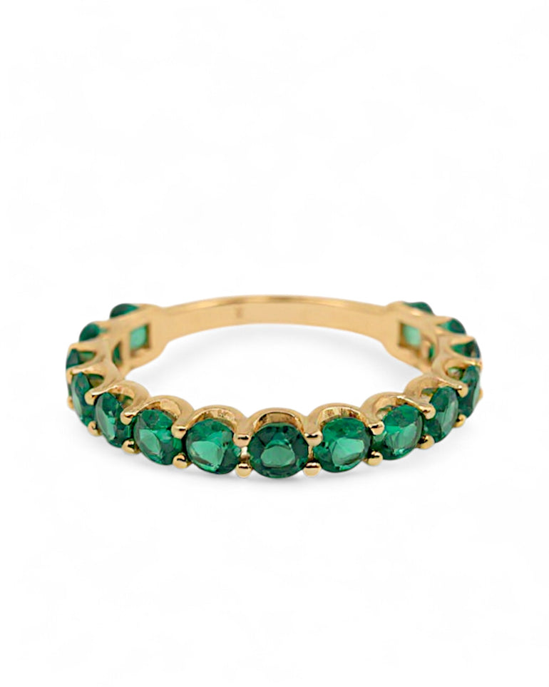 טבעת מעוצבת בזהב צהוב עם שיבוץ מלא של אבני חן ירוקות עגולות, המקיפות את כל היקף הטבעת ליצירת מראה עשיר ונוצץ מכל כיוון. כל אבן משובצת בתוך תושבת פתוחה עם ארבע שיניים זהובות, המדגישות את הצבע העמוק ומאפשרות חדירת אור לזוהר מרבי. המבנה האחיד והמדויק מעניק לטבעת איזון מושלם בין אלגנטיות לנוכחות.