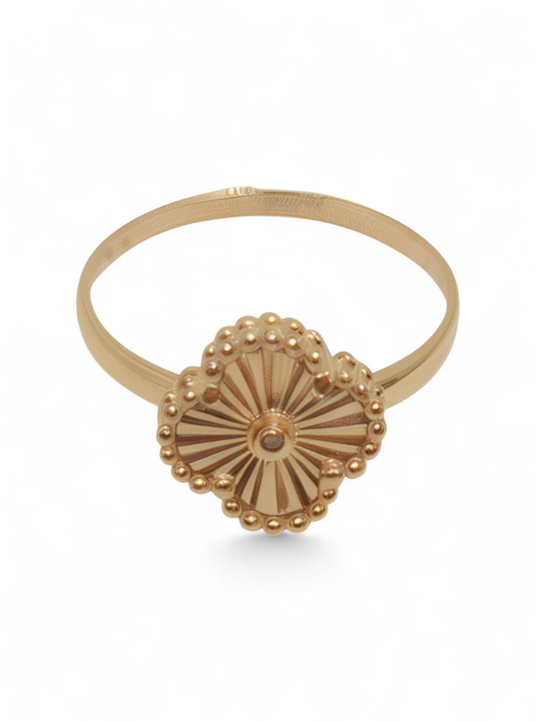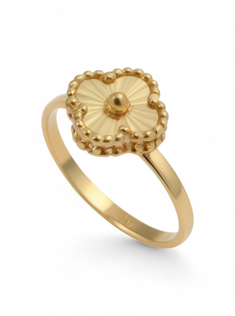 טבעת זהב בעיצוב פרחוני ייחודי, בעלת חלק עליון בצורת פרח עדין עם טקסטורת קרניים מרכזית המוסיפה עומק וברק. מסגרת עלי הכותרת מעוטרת בכדורי זהב קטנים המקיפים את הצורה כולה, ליצירת מראה אלגנטי ומוקפד. השילוב בין הזהב הצהוב המבריק לבין העיטור התלת-ממדי מעניק לטבעת מראה נשי, חגיגי ומרשים – מושלם לשימוש יומיומי או לאירועים מיוחדים.
