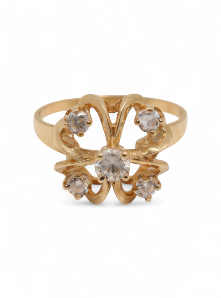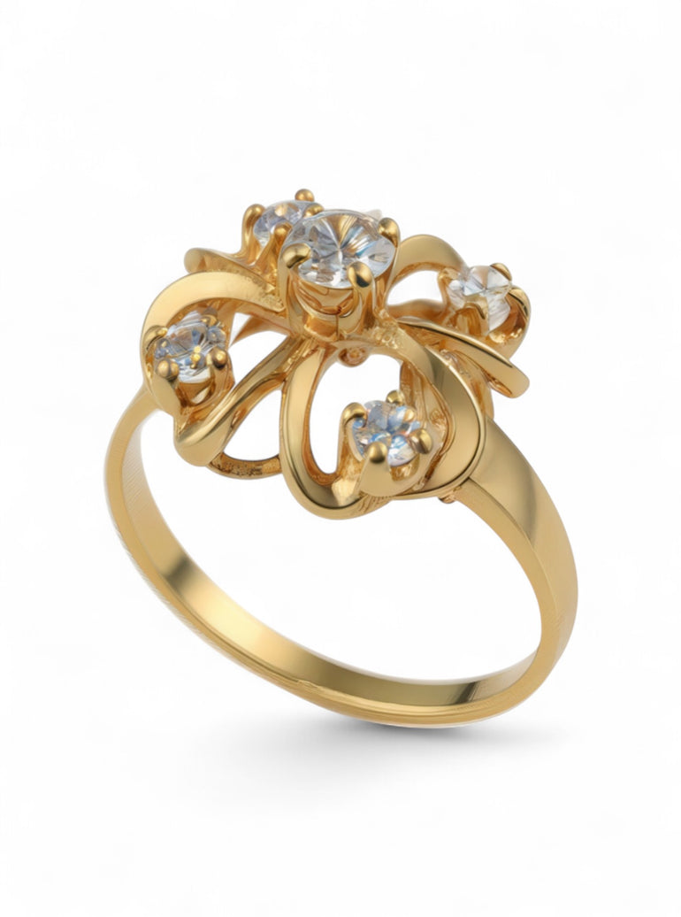 טבעת זהב בעיצוב אלגנטי ומרהיב, בעלת חלק עליון המעוצב בצורת פרח פתוח עם חמישה שיבוצי זירקונים נוצצים – אבן מרכזית בוהקת במרכז, וסביבה ארבע אבנים נוספות המשובצות בתושבות גבוהות להדגשת הברק. הקווים הזורמים והעדינים מעניקים לטבעת מראה נשי ומיוחד, המשלב יוקרה עם עדינות קלאסית. מתאימה הן לשימוש יומיומי והן כהשלמה לאירועים חגיגיים.