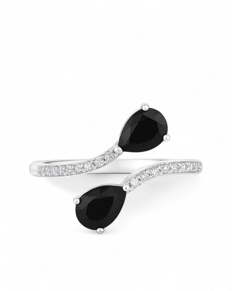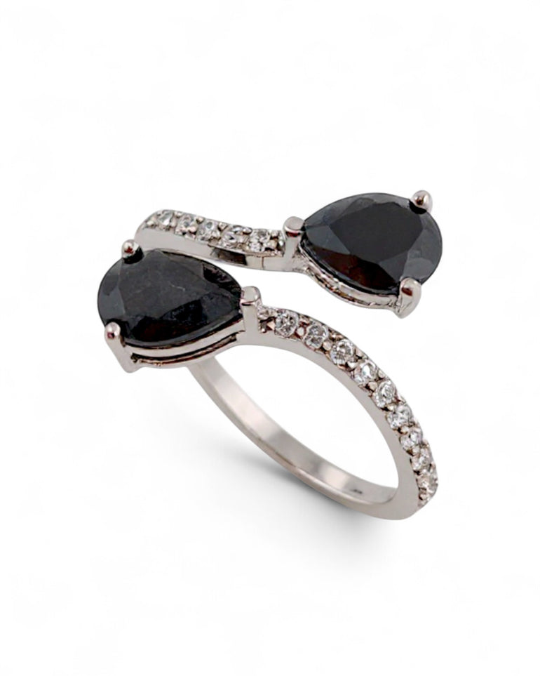 טבעת פתוחה בעיצוב מודרני ונועז, עם שתי אבני חן שחורות בחיתוך טיפה משני קצותיה, המשובצות כל אחת בתוך תושבת פתוחה שמבליטה את צורתן הדרמטית. לאורך הטבעת שיבוץ זירקונים קטנים ונוצצים המעניקים ניגוד מרשים לגוון השחור העמוק של האבנים המרכזיות. עיצוב מרשים שמתאים במיוחד לנשים שאוהבות לשלב אלגנטיות עם אמירה אישית.