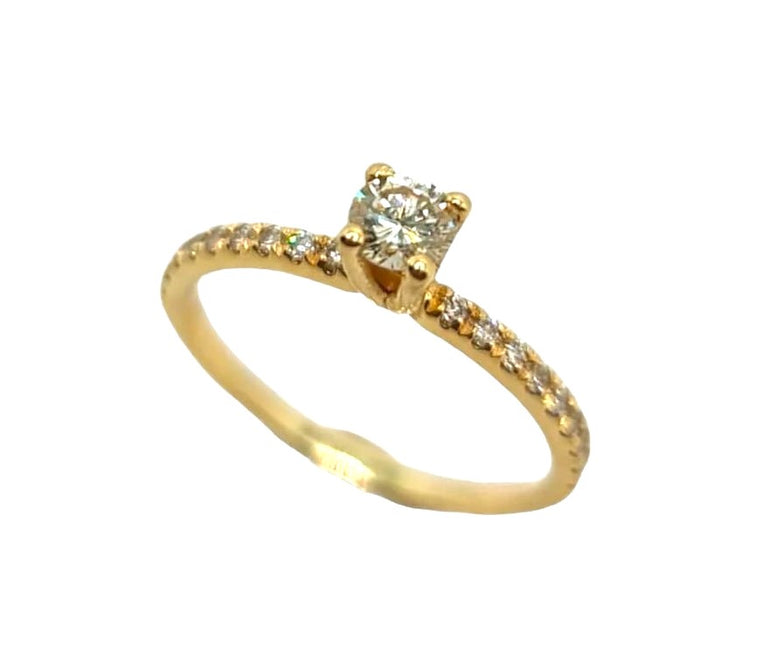 טבעת יהלומים הכי מיוחדת, להצעת נישואין או סתם לפנק את האישה בצורה קלאסית אשר משובצת אבן מרכזית קלאסית למראה מיוחד. טבעת יהלומים זהב צהוב 14 קראט משובצת 0.24 קראט יהלום ובצדדים משובץ 0.19 קראט יהלומים מבריקים ונוצצים שישדרג את הלוק היום יומי ויעניק לך זוהר וברק!