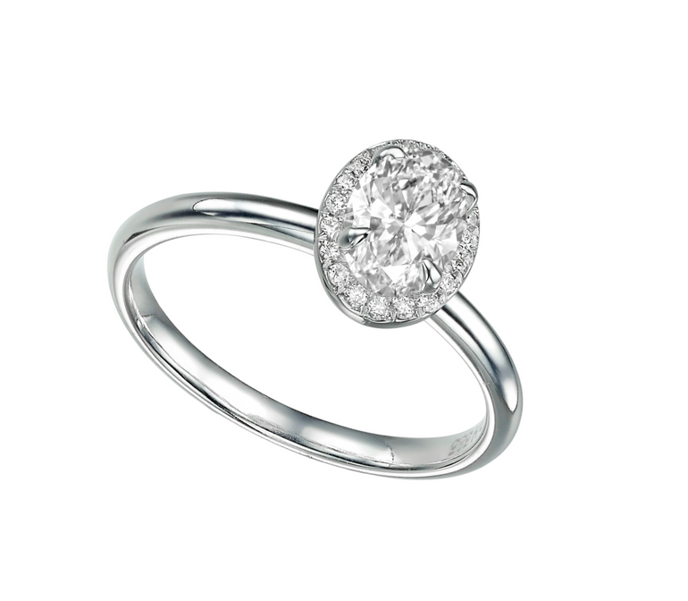 טבעת יהלום מזהב צהוב 14 קראט המעוצבת עם אבן מרכזית אחת גדולה בצורה אובלית , מסביב לאבן האובלית יש שיבוץ עדין של יהלומים ובצידי הטבית חלק מבריק. הטבעת עדינה ונוצצת. נותן מראה עדין וקלאסי לבחורות עדינות ביותר.