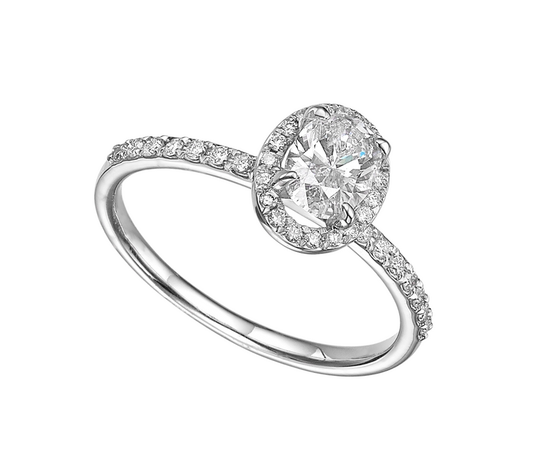 טבעת יהלום מזהב צהוב 14 קראט המעוצבת עם אבן מרכזית אחת גדולה בצורה אובלית , מסביב לאבן האובלית יש שיבוץ עדין של יהלומים ובצידי הטבית משובץ גם בשורת יהלומים קטנים.  הטבעת עדינה ונוצצת. נותן מראה עדין וקלאסי לבחורות עדינות ביותר.