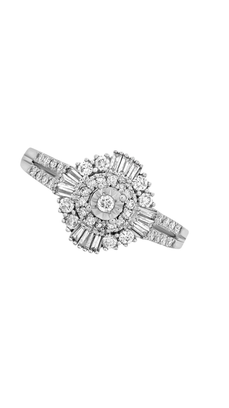 טבעת זהב לבן 14 קראט דגם R-RR573, המשובצת במרכז הטבעת יהלום קטן ומסביבו חיתוכי לייזר ואז שוב מעטפת של יהלומים קטנים ובקצה של הסיבוב יש שוב שיבוץ של יהלומים קטנים משולבים יהלומי בגטים ובצידי הטבעת יש שתי שורות של שיבוץ יהלומים קטנים , סה"כ היהלומים בכל הטבעת 55=0.48 קראט . היהלומים משובצים על 4 שיניים, שתופסות את האבנים בחוזקה ועוצמה ונותנות ביטחון לאבן, בנוסף נותן גם מראה של כתר על ידך.