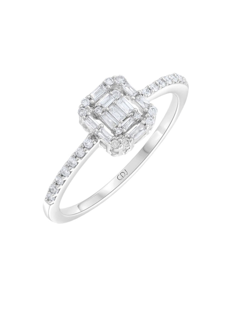 טבעת זהב לבן 14 קראט דגם R-RR341, המשובצת במרכז הטבעת יהלומים בצורת בגטים ומסביב יהלומים קטנים וגם בצידי הטבעת יש שיבוץ ביהלומים קטנים , סה"כ היהלומים בכל הטבת 37=0.22 קראט . היהלומים משובצים על 4 שיניים, שתופסות את האבנים בחוזקה ועוצמה ונותנות ביטחון לאבן, בנוסף נותן גם מראה של כתר על ידך.