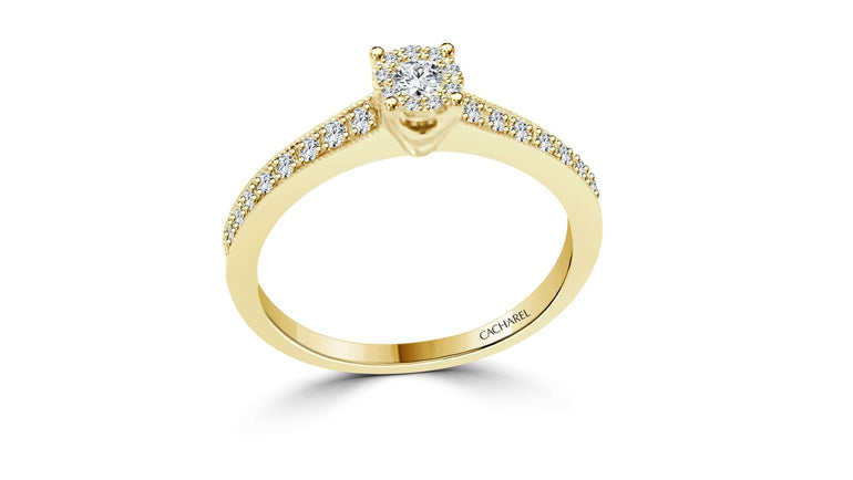 טבעת אירוסין יהלומים דגם פיירו משובצת במרכז הטבעת יהלום גדול ומסביב עוטף את היהלום עוד יהלומים קטנים יפים ומבריקים ובצידי הטבעת עוד שורת יהלומים עדינים, לפנק את האישה בכל ימיות השבוע.טבעת יהלומים זהב צהוב K14 קראט משובצת יהלומים 0.30ct קראט יהלום מבריק ונוצץ שישדרג את הלוק היום יומי ויעניק לך זוהר וברק