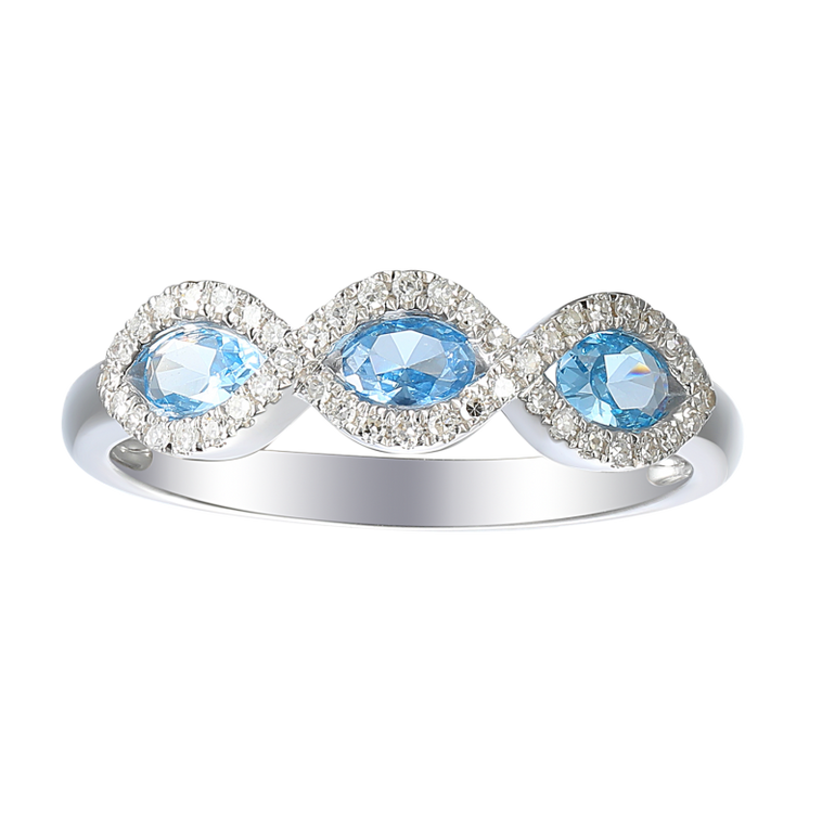 טבעת יהלומים וינטג' | צורת שורת אליפסות | מרכזית אקווה מרין ומסביב יהלומים | זהב לבן 14 קראט | דגם שריי