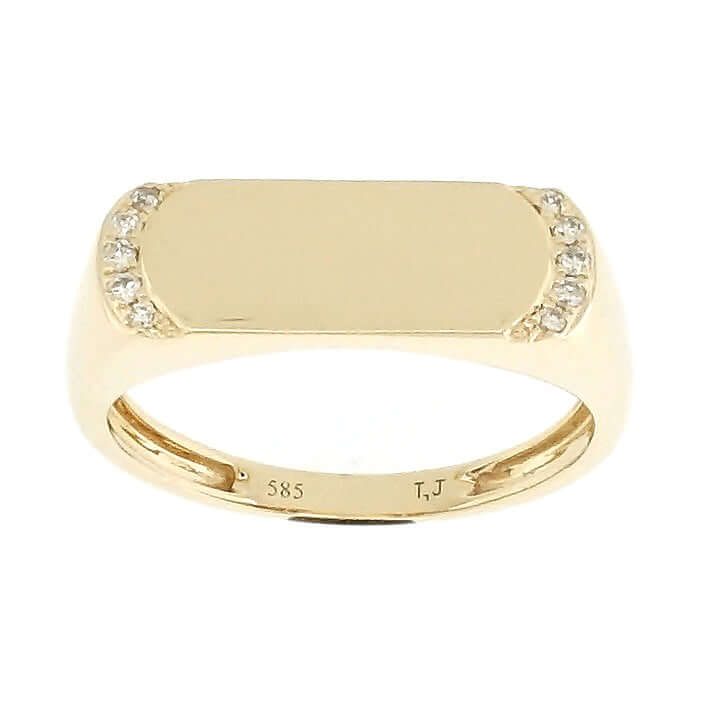 טבעת פלטה מלבנית רחבה מיועדת לחריטה משובצת יהלומים בצידי הטבעת , לפנק את האישה בכל ימיות השבוע.טבעת יהלומים זהב צהוב K14 קראט משובצת 10 יהלומים 0.06ct  קראט יהלום מבריק ונוצץ שישדרג את הלוק היום יומי ויעניק לך זוהר וברק