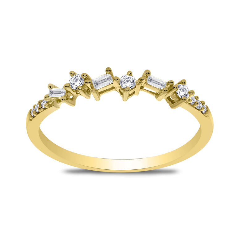 טבעת שורת אבנים חצי נישואין משולבת יהלומי בגט ויהלומים עגולים קטניםבצורת זיגזג היהלומים קטנים יפים ומבריקים, לפנק את האישה בכל ימיות השבוע.טבעת יהלומים זהב צהוב K14 קראט משובצת יהלומים 0.12ct קראט יהלום מבריק ונוצץ שישדרג את הלוק היום יומי ויעניק לך זוהר וברק