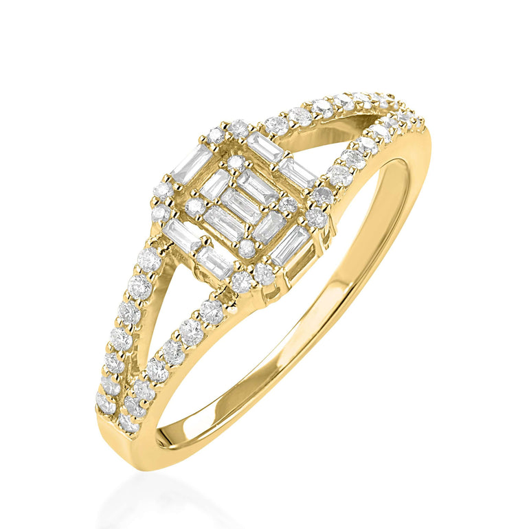 טבעת אירוסין יהלומים מיוחדת באמצע מרובעת מחוברת עם שתי שורות בצדדים הטבעת משולבת יהלומי בגט באמצע וסביב יהלומים קטנים יפים ומבריקים, לפנק את האישה בכל ימיות השבוע. טבעת יהלומים זהב צהוב 14 קראט משובצת יהלומים יש בה 51 אבנים שהס"כ שלהם זה 0.29 קראט יהלום מבריקים ונוצצים שישדרג את הלוק היום יומי ויעניק לך זוהר וברק