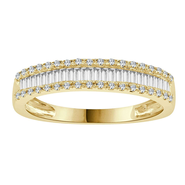 טבעת שורת יהלומים חצי נישואין משובצת אבני בגט באמצע ומעל 2 שורות עדינות של יהלומים קטנים ומבריקים , לפנק את האישה בכל ימיות השבוע.טבעת יהלומים זהב צהוב K14 קראט משובצת יהלומים 0.31ct קראט יהלום מבריק ונוצץ שישדרג את הלוק היום יומי ויעניק לך זוהר וברק