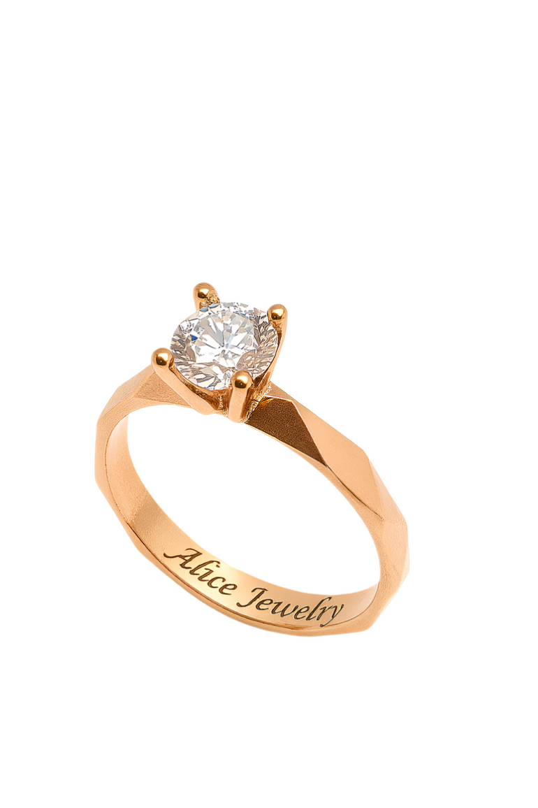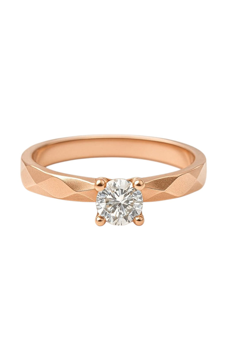 טבעת ייחודית בעיצוב סוליטר, עשויה זהב רוז גולד 14 קראט בגימור מט יוקרתי. גוף הטבעת מעוצב בגאומטריה זוויתית וחזקה, המשווה לה מראה מודרני ונועז. במרכז משובצת אבן זירקון עגולה וגדולה, בשיבוץ פתוח של 4 שיניים, שמאפשר לאור לחדור ולשדר זוהר מרשים במיוחד. שילוב בין קלאסיקה לנועזות – מושלם למי שמחפשת תכשיט עם נוכחות אישית.