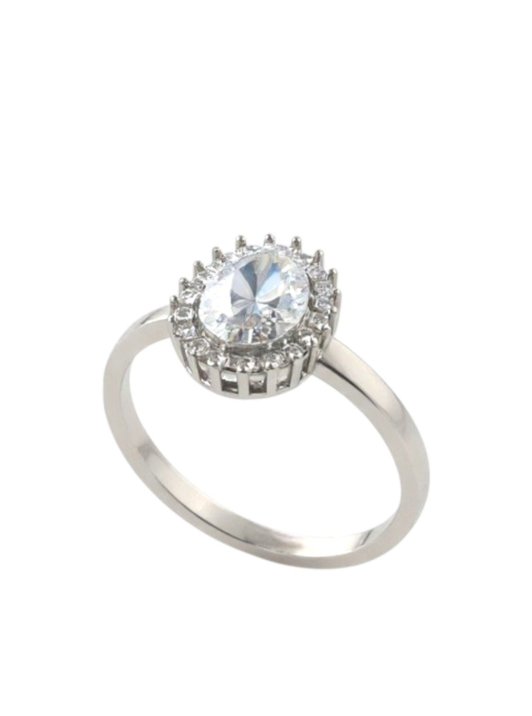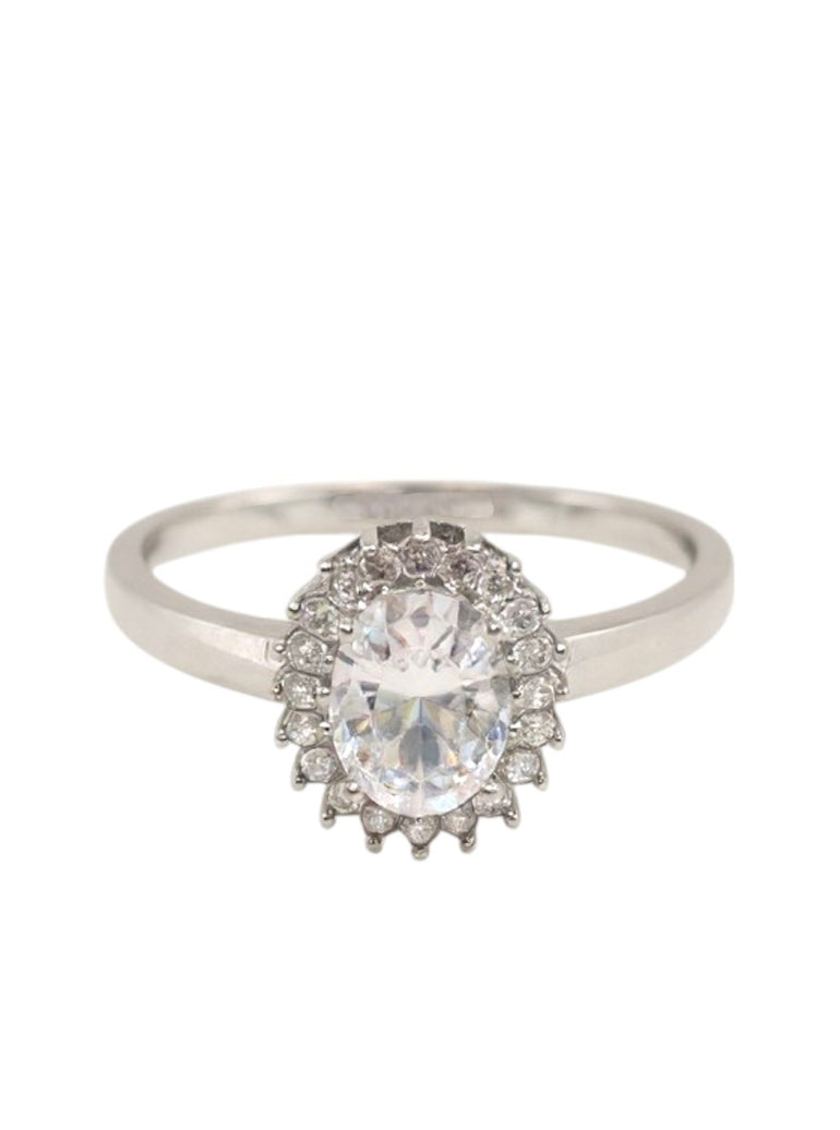 טבעת בעיצוב קלאסי ואלגנטי, עם אבן מרכזית סוליטרית בולטת בצורה אובלית – המשובצת במרכז מסגרת זירקונים קטנים בצורת הילה מנצנצת. התושבת הגבוהה והפתוחה מדגישה את האבן המרכזית ומכניסה אליה אור מכל כיוון, ליצירת ברק מרבי. גוף הטבעת חלק ונקי בגימור מבריק, המשלים את המראה האלגנטי בצורה הרמונית ומאוזנת.