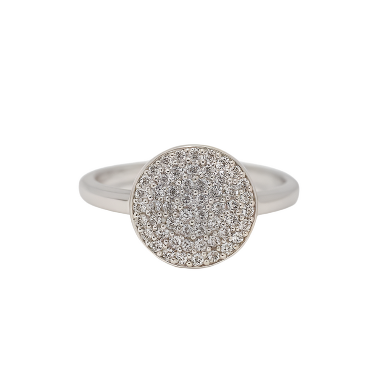 טבעת מעוצבת עם נוכחות ייחודית ומודרנית, עשויה זהב לבן 14 קראט בגימור חלק ומבריק. במרכזה פלטה עגולה רחבה, המשובצת בעשרות זירקונים קטנים בצפיפות גבוהה, היוצרים מראה נוצץ במיוחד ועשיר בפרטים. הפלטה משתלבת בגוף טבעת דק ונקי, היוצר איזון בין אלגנטיות קלאסית לבין סטייל עדכני ובולט. מתאימה לנשים שאוהבות תכשיטים עם נוכחות וזוהר.