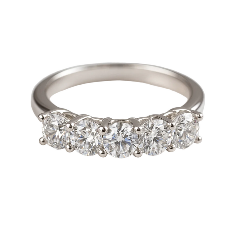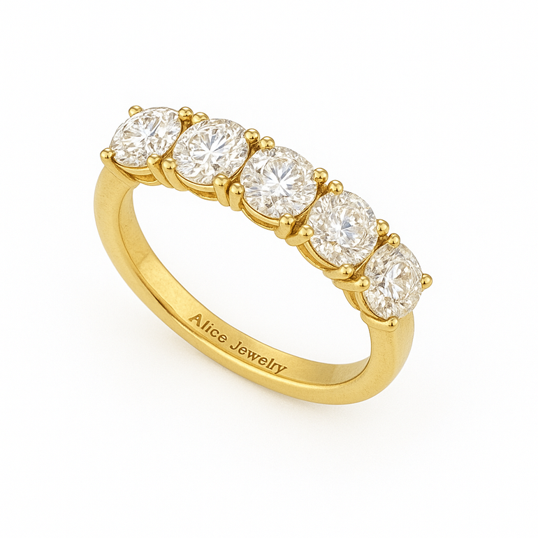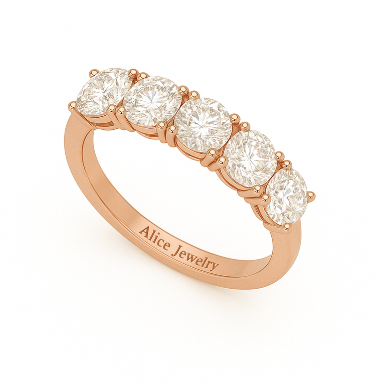 טבעת יוקרתית בעיצוב חצי נישואין קלאסי, משובצת בחמישה זירקונים גדולים בחיתוך עגול, הנפרסים לכל רוחב החלק העליון של הטבעת. כל אבן משובצת בתוך תושבת שיניים כפולה, המעניקה יציבות וביטחון לשיבוץ – לצד נוכחות מרשימה ונצנוץ בלתי פוסק. גוף הטבעת חלק, מלוטש, ומדגיש את טווח האבנים בצורה מאוזנת ומוקפדת.