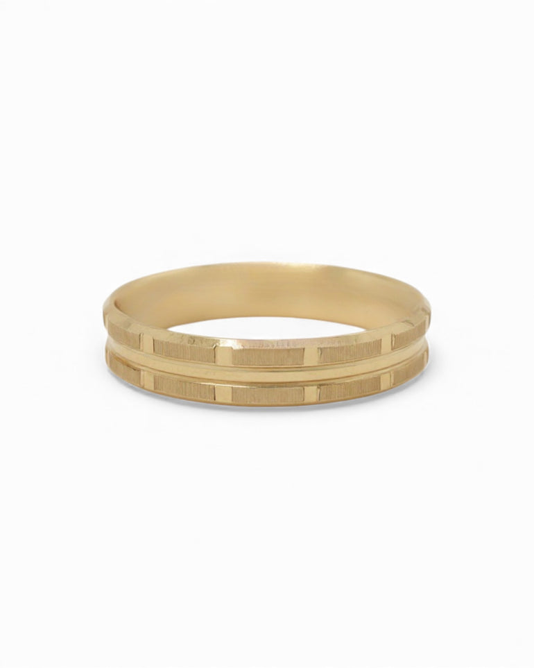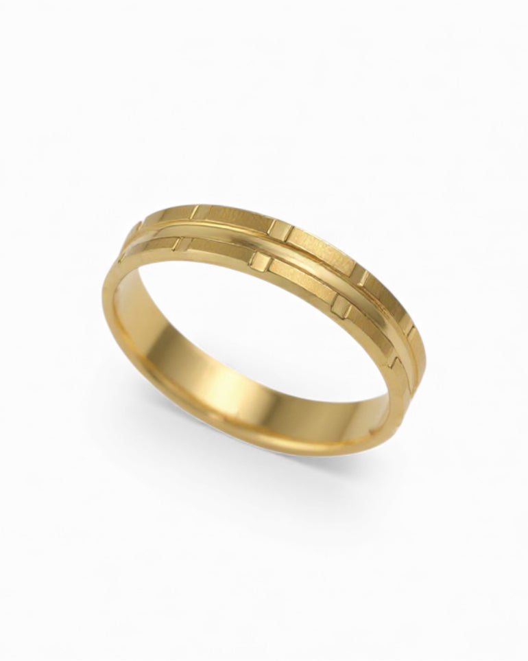טבעת נישואין מעוצבת בזהב צהוב 14 קראט, בעלת דוגמת מקטעים מלבניים החוזרים לאורך שני פסי קישוט עליונים. כל מקטע נחרט בלייזר בדיוק גבוה, יוצר משחק גברי של אור וצל, ומעניק לטבעת מראה מובחן ומסודר עם תחושת עומק נקייה. המבנה הכפול של הפסים מבליט את הטקסטורה ויוצר נוכחות מאוזנת שלא מושכת יותר מדי תשומת לב — אבל בהחלט משדרת סטייל מוקפד.