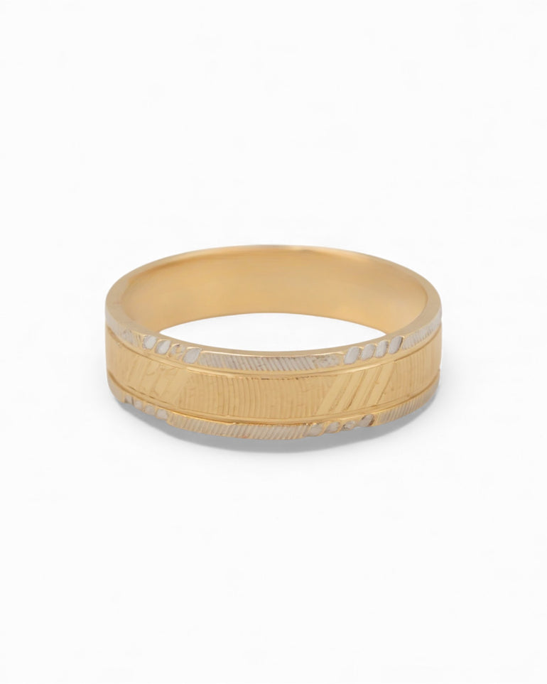 טבעת נישואין ייחודית המשלבת שתי רצועות צד עדינות מזהב לבן, שביניהן עובר פס מרכזי מזהב צהוב עם טקסטורת חריטה ברורה ומאופיינת. החיבור בין הגוון הקריר של הזהב הלבן לבין החמימות של הזהב הצהוב יוצר מראה יציב, נקי ומדויק, עם נוכחות גברית ברורה. כל תווי החריטה נשמרים בצורה חדה ואמיתית — בדיוק כפי שנראים בטבעת המקורית.