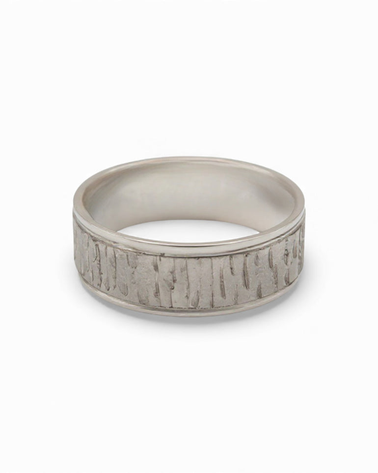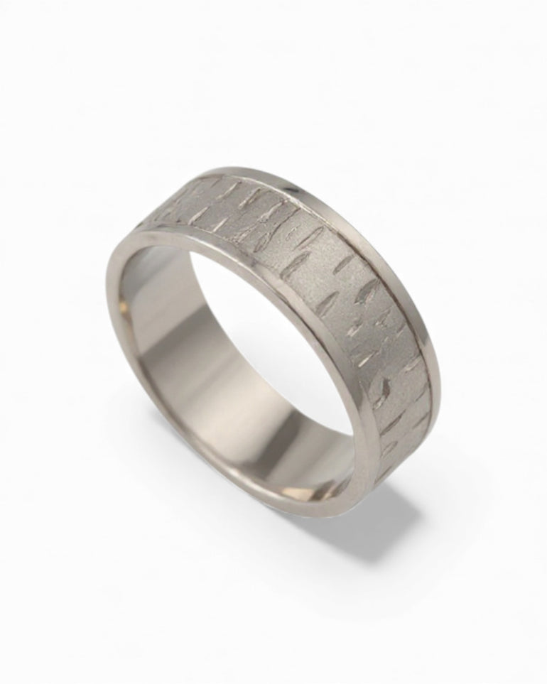 טבעת נישואין רחבה ומרשימה בעיצוב מודרני, עם טקסטורת פסים מחוספסת במרכז שיוצרת עומק ואופי ייחודי. שולי הטבעת החלקים יוצרים מסגרת נקייה שמדגישה את הטקסטורה המרכזית ומעניקה לטבעת מראה מאוזן ומדויק. שילוב זה מעניק תחושה חזקה, אלגנטית וגברית — מושלם למי שמחפש טבעת בולטת אך לא מוגזמת.