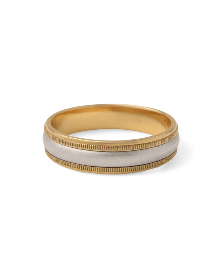 טבעת נישואין מעוצבת בקו נקי ואלגנטי, המשלבת גוף מרכזי במראה זהב לבן מט מוקפד, ומסגרות זהב צהוב 14 קראט משני הצדדים. הקנטים כוללים חריטת לייזר מחורצת ועדינה המקיפה את כל ההיקף ומעניקה לטבעת אופי מודרני ומדויק. שילוב הצבעים יוצר קונטרסט מרהיב שמעניק לטבעת נוכחות קלאסית אך ייחודית — בחירה מצוינת למי שאוהב עיצוב אלגנטי עם טוויסט עדין ומדויק.