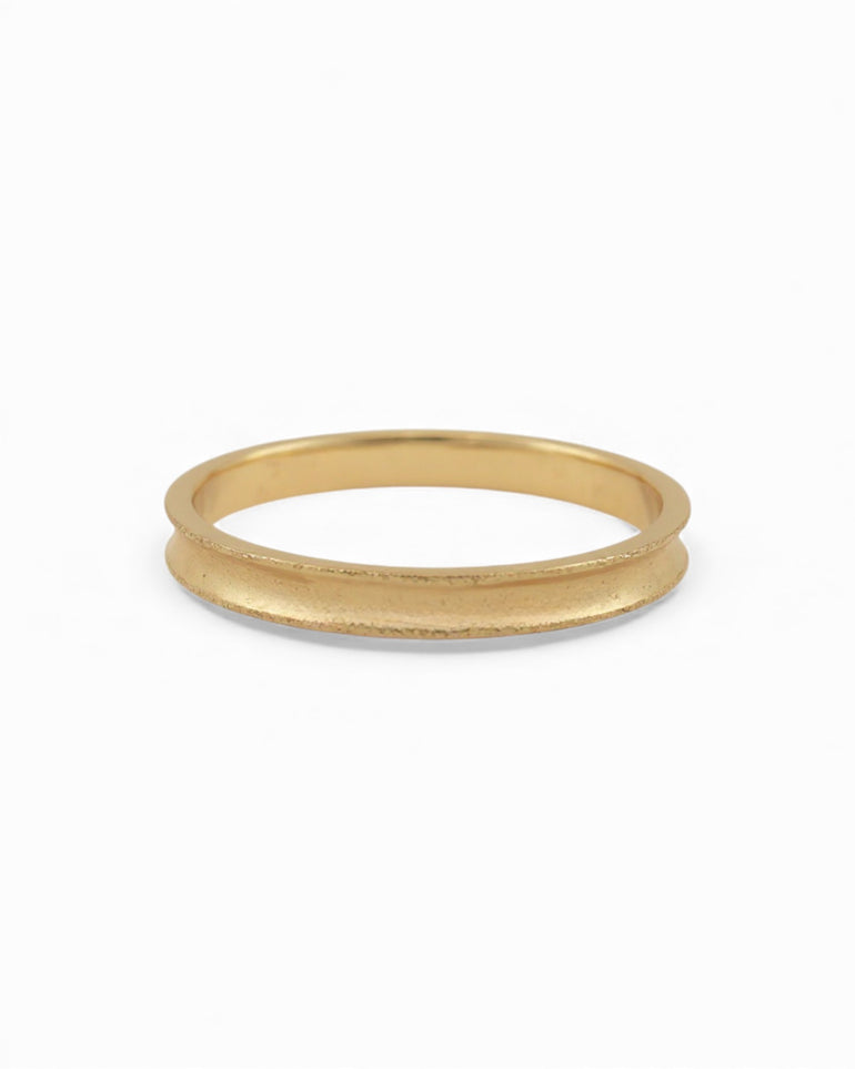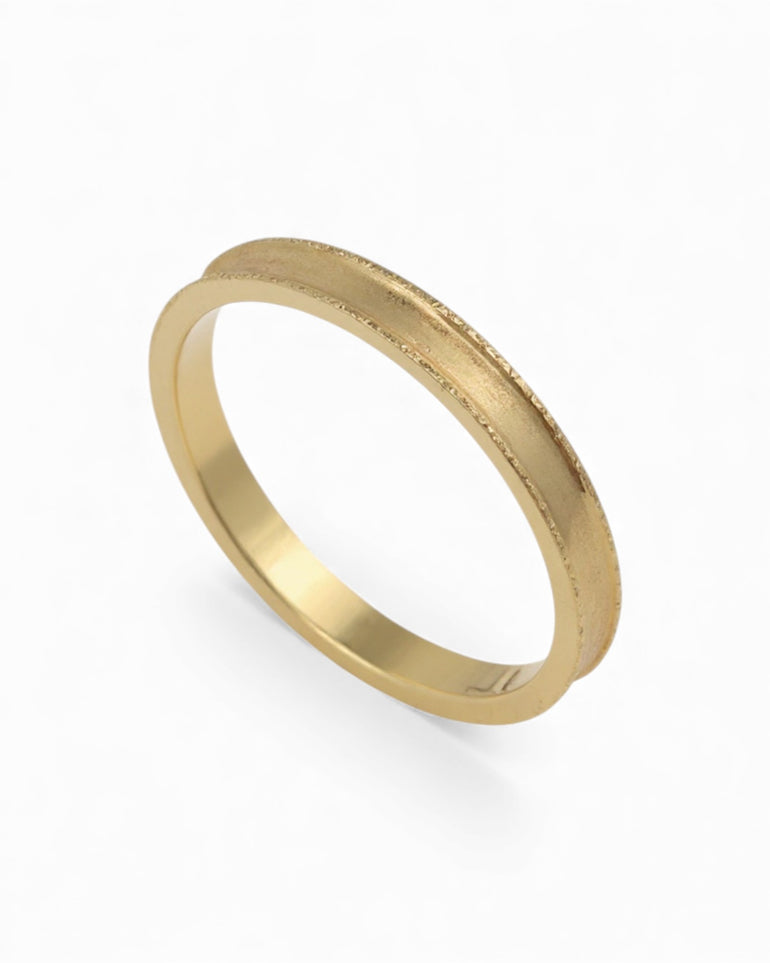 טבעת נישואין דקיקה ומדויקת, בעיצוב שמבליט תעלה עדינה החוצה את מרכז הטבעת בין שני קנטים מוגבהים. המבנה הזה יוצר מראה גברי ונקי, עם משחק עומק עדין שמעניק לטבעת נוכחות למרות רוחבה הצר. הגימור שקט, מאוזן, ומתאים במיוחד למי שאוהב קווים מינימליסטיים אך עם טוויסט עיצובי קל.