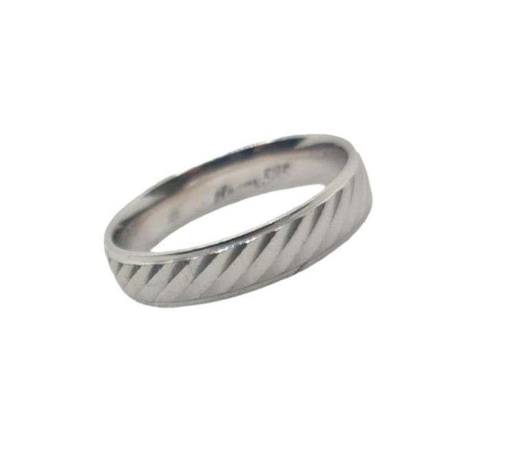 טבעת נישואין בעיצוב מודרני ונקי, עם חריצים אלכסוניים עמוקים החוזרים על עצמם לכל היקפה, ויוצרים תחושת תנועה ואור. הגימור המלוטש של הזהב הלבן מחזק את אפקט הברק וההחזריות, והתוצאה – טבעת עם קווים גיאומטריים ברורים אך אלגנטיים. מתאימה במיוחד למי שמעדיפה עיצוב חד, מדויק ולא מתפשר.