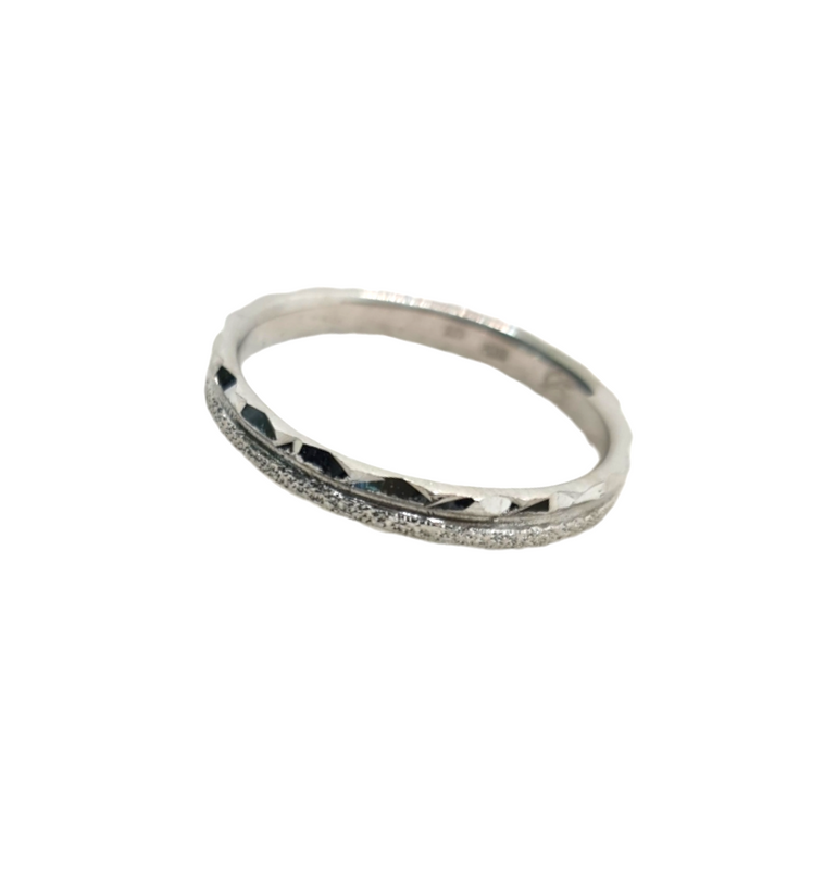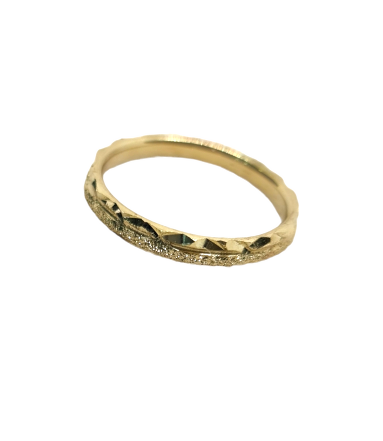 טבעת נישואין דקה בעיצוב עשיר בפרטים, המשלב בין טקסטורת נצנוץ עדינה לבין חריטות גיאומטריות בצורת פירמידות קטנות. החיבור בין השניים יוצר אפקט אור נוצץ שמבליט את הזהב הצהוב ומעניק תחושת תנועה מתמשכת לאורך כל היקף הטבעת. טבעת זו מתאימה במיוחד למי שמחפשת עיצוב צר, אך כזה שלא מוותר על עומק וסגנון.