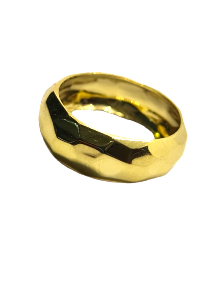 טבעת נישואין בעיצוב גולמי ומודרני, בעלת טקסטורת פאות ידנית בגימור מבריק. כל פאה יוצרת שבירת אור ייחודית, כך שנוצר מראה זוויתי אך אלגנטי – שילוב של עוצמה ורכות. הטבעת בעלת נפח מורגש אך שומרת על קווים מעוגלים ונעימים על היד. מושלמת למי שמחפש טבעת עם אמירה אישית ואומנותית.