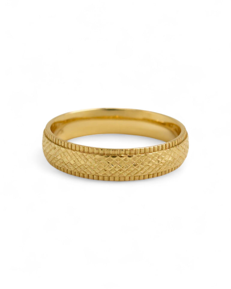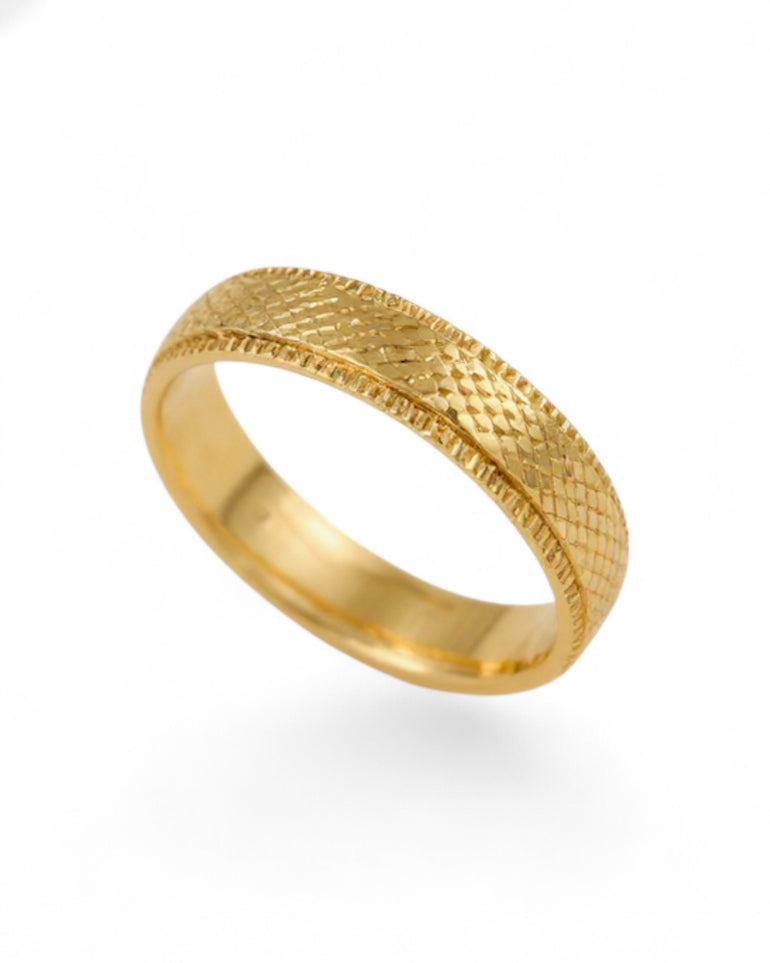 טבעת נישואין מרשימה בעיצוב קלאסי עם טקסטורת לייזר גאומטרית ייחודית, המבוססת על חיתוכים אלכסוניים בצורת V המשתחזרים לאורך כל ההיקף. הדוגמה האלכסונית יוצרת משחק אור מלא עומק וברק, ומעניקה לטבעת מראה מודרני ומדויק. שפת הטבעת מעוטרת חריצה עדינה היוצרת מסגרת נקייה ומבליטה את עבודת הלייזר המוקפדת. יחד מתקבלת טבעת עשירה בפרטים, נוחה לענידה יומיומית ובעלת נוכחות אלגנטית.