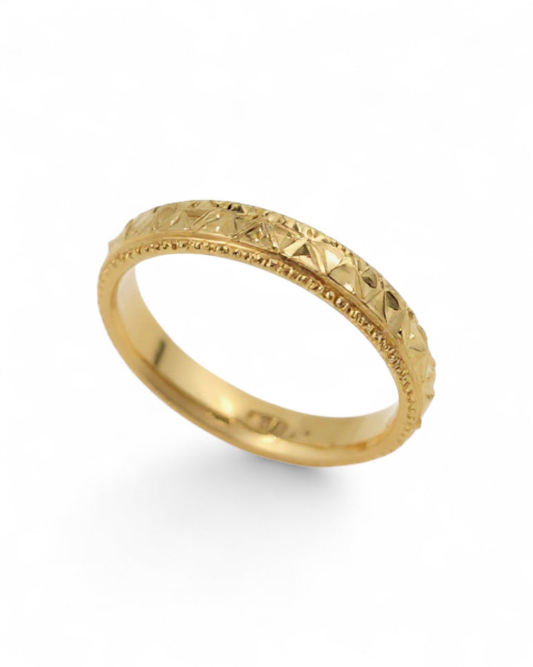 טבעת נישואין דקה ומוקפדת בעיצוב גאומטרי ייחודי, עם טקסטורת לייזר המורכבת מחיתוכים בצורת קוביות אלכסוניות החוזרות לאורך כל ההיקף. הדוגמה המדויקת יוצרת ברק רב־כיווני ונראות עשירה, בזמן שהשפה המשוננת המקיפה את העיטור מעניקה מסגרת נקייה ומודגשת. השילוב בין החיתוכים האלכסוניים לגימור הזהב הצהוב יוצר טבעת אלגנטית, בולטת ונוחה לענידה יומיומית, עם תחושה של עיצוב יוקרתי ומדויק.
