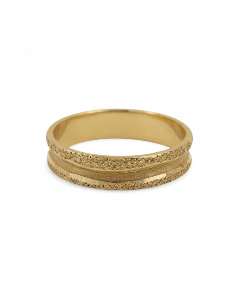 טבעת נישואין אלגנטית עם שלושה אזורים עיצוביים: במרכז אזור חלק ונקי, ובשני הצדדים פסי נצנצים עדינים המוסיפים ברק ייחודי לאורך הטבעת. העיצוב מעניק שילוב מושלם בין קלאסיות לנגיעה מודרנית, ויוצר מראה בולט ומדויק שמחמיא לכל יד.
