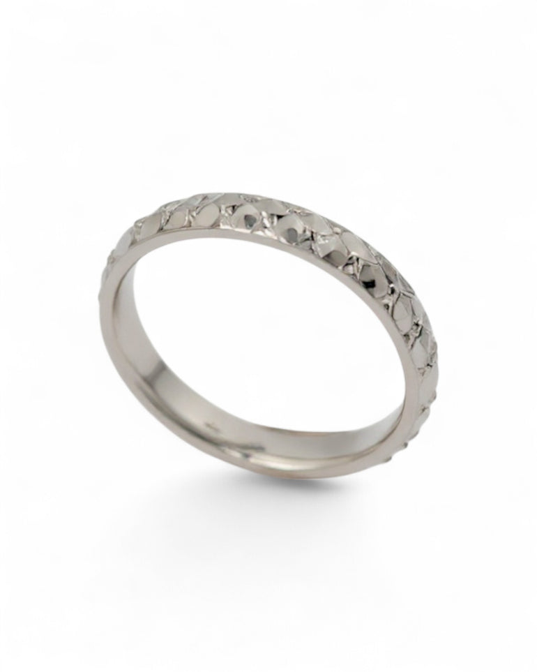 טבעת נישואין קלאסית בעיצוב נקי ואלגנטי, עם חריטת לייזר בצורת מעויינים היוצרת טקסטורה גאומטרית מבריקה סביב כל ההיקף. הדוגמה הזוויתית מעניקה לטבעת מראה מודרני ויוקרתי, תוך שמירה על קווים עדינים ונוחות מרבית לענידה יומיומית. הברק של זהב לבן מודגש בזכות החיתוכים המדויקים, ויחד נוצר תכשיט מוקפד ומתאים לכל סגנון אישי.