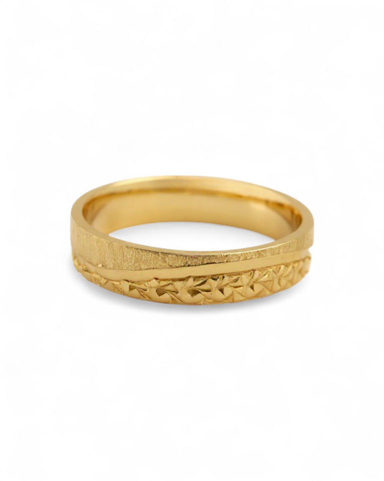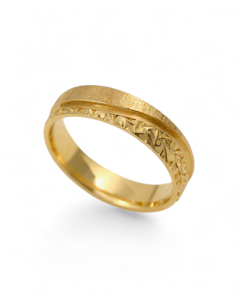 טבעת נישואין רחבה ובעלת נוכחות, המשלבת בצורה ייחודית בין פני שטח מטיים לבין עיטור לייזר גאומטרי עשיר בפרטים. חלקה העליון של הטבעת מעוצב בגימור מט עדין ונקי, המעניק מראה שקט ויוקרתי. מתחתיו מופיעה רצועת חריטת לייזר עמוקה בצורות זוויתיות, היוצרות משחק אור מרשים וברק מודגש. השילוב בין הגימור המט לבין העיטור המבריק יוצר איזון מדויק בין פשטות לאלגנטיות, ומתאים לענידה יומיומית עם מראה יוקרתי ומדויק.