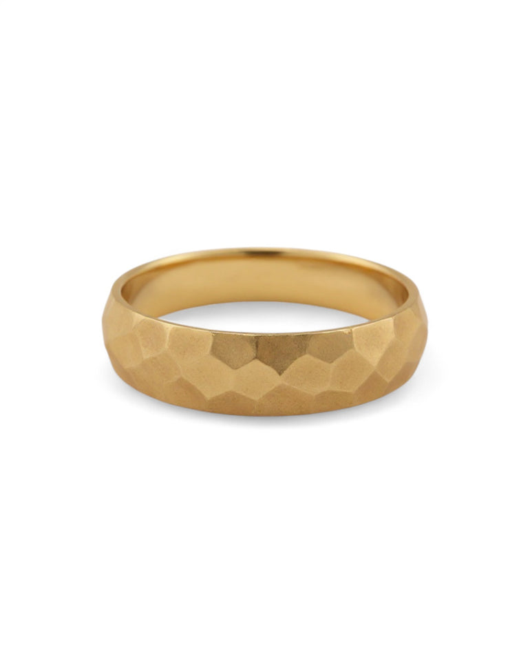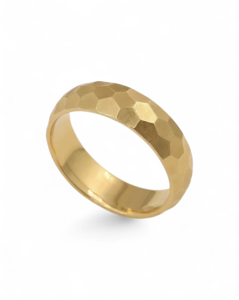 טבעת נישואין מרשימה בעיצוב רך ומודרני, עם טקסטורת ריקועים עדינה על פני השטח המעניקה אפקט של פאות קטנות וזוויתיות. המרקם יוצר משחק יפהפה של אור וצל, שמעניק לטבעת מראה יוקרתי אך טבעי ולא מתאמץ. העובי הבינוני והחתך הנקי מבטיחים נוחות גבוהה לצד נוכחות אלגנטית — בחירה נהדרת למי שמעדיפה טבעת מיוחדת אך קלאסית.