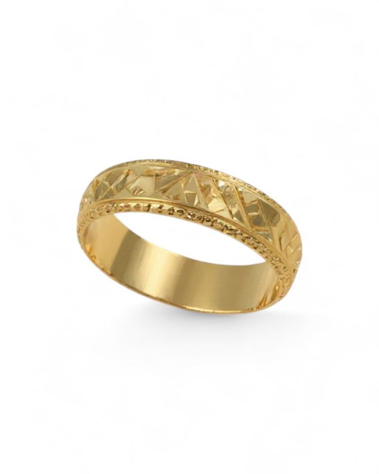 טבעת נישואין קלאסית ובולטת בעיצוב גאומטרי מרשים, המורכב מפאות משולשות ומלוטשות היוצרות משחק אור חי ועמוק לאורך כל ההיקף. דפנות הטבעת מעוטרות בקנט עדין במראה חרוזי עדין, שמוסיף שכבת יוקרה ושובר בעדינות את הזוויות החדות של הדוגמה המרכזית. טבעת עשירה במראה, אך נשארת נוחה ונעימה לענידה יומיומית.