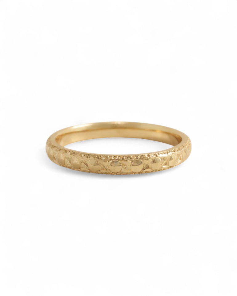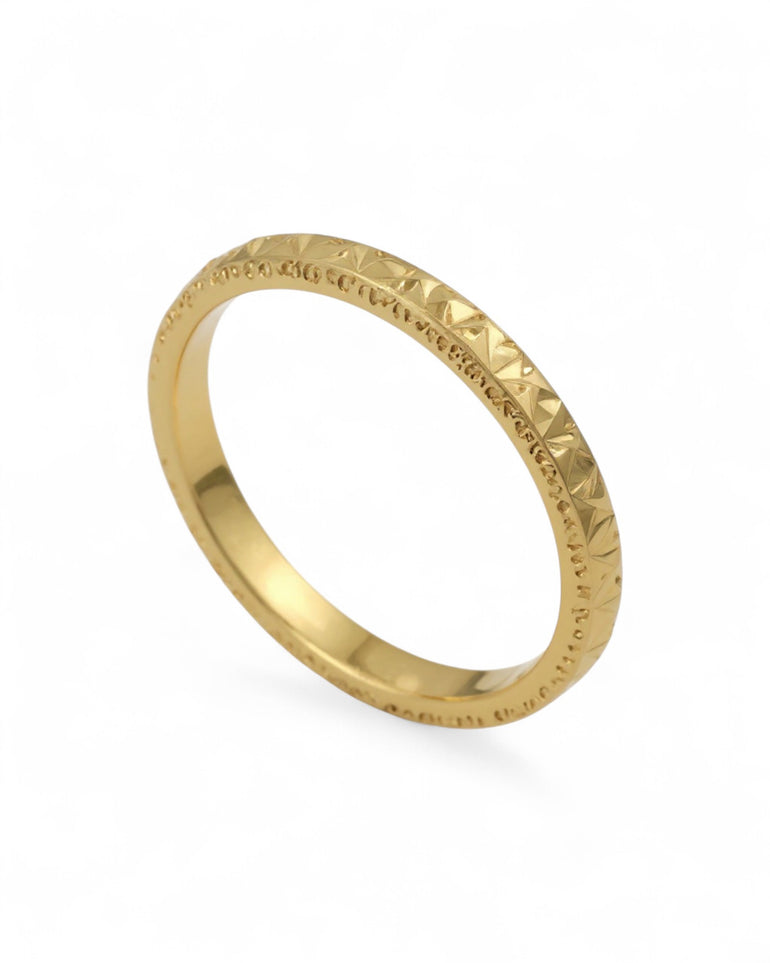 טבעת נישואין דקה ואלגנטית בעיצוב גאומטרי עדין, הכולל פאות קטנות ומלוטשות היוצרות משחק אור מיוחד לכל אורך ההיקף. בצדדים מופיעה חריטת לייזר עדינה המוסיפה מסגרת מעודנת ומשלימה את המרקם המרכזי. השילוב בין הדקות של הטבעת לבין הטקסטורה המנצנצת מעניק לה מראה יוקרתי, נקי וייחודי — מושלמת לאוהבות קו אלגנטי אך לא שגרתי.