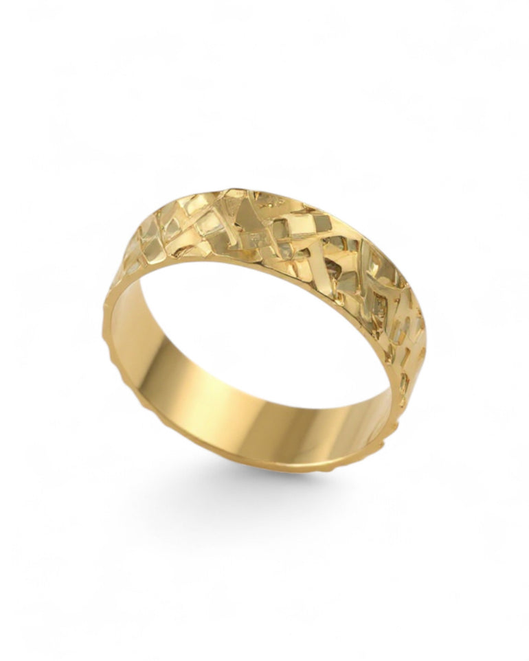 טבעת נישואין ייחודית בעיצוב טקסטורה גאומטרית שבורה, המורכבת מפאות קטנות ולא אחידות היוצרות הברקה חזקה ומשחק אור מרשים לאורך כל ההיקף. הדוגמה מחוספסת-מפתיעה אך נשארת נקייה ואלגנטית, ומשדרת תחושה של עבודת יד מדויקת. הדפנות החלקות מאזנות את הטקסטורה ומדגישות את המראה היוקרתי.