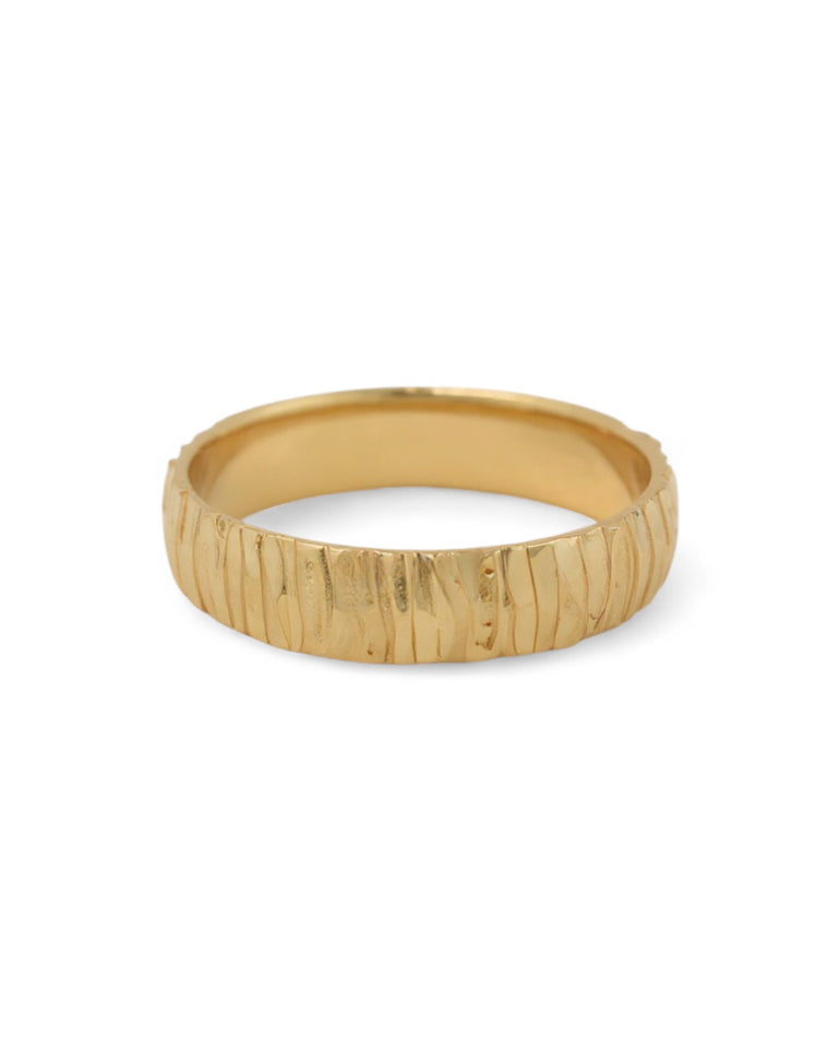 טבעת נישואין בעלת טקסטורה של פסים אנכיים מחורצים, המשלבים חלקים מלוטשים לצד חריטת לייזר עדינה. הדוגמה יוצרת מראה בעל עומק ומשחקי אור חזקים, שמעניקים לטבעת אופי מודרני אך עם נגיעה קלאסית. הדפנות החלקות מעניקות איזון ומדגישות את העבודה המדויקת במרכז הטבעת.