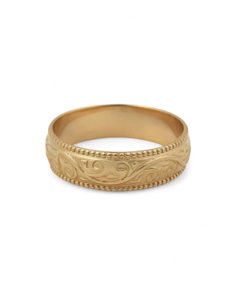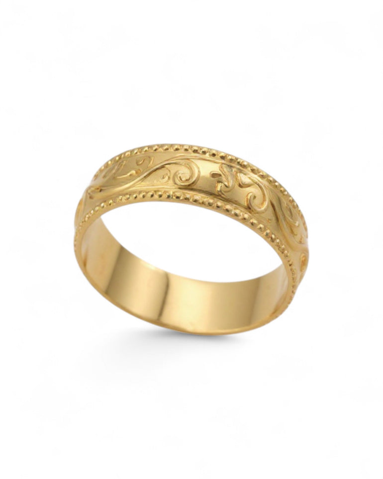 טבעת נישואין בעיצוב מרוקאי מסורתי, עם עיטורי גלילה מגולפים בחריטת לייזר שיוצרים מראה עשיר ומלא אופי. הדוגמה הזורמת מעניקה תחושת תנועה ואלגנטיות, בעוד שקנט חרוזים עדין משני הצדדים מוסיף מסגרת יוקרתית ומדויקת. שילוב הפרטים מעניק לטבעת נוכחות בולטת ומראה אותנטי שמייחד את הסגנון המרוקאי הקלאסי.