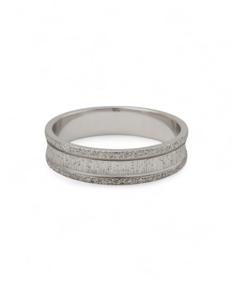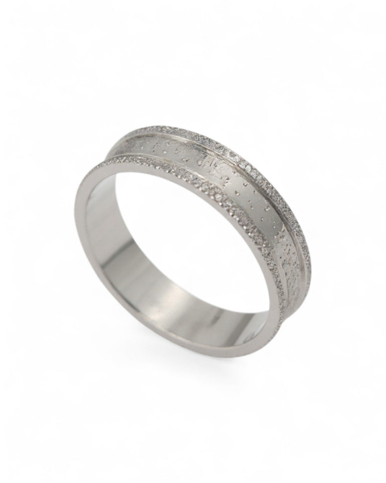 טבעת נישואין בעלת עיצוב נקי ומודרני, המשלבת פס מרכזי חלק וסולידי המוקף משני צדדיו בפסי נצנוץ עדינים. הנצנוץ נעשה בחריטת לייזר מדויקת, היוצרת הבזקי אור עדינים ואלגנטיים לאורך כל ההיקף. שילוב המרקמים יוצר איזון יפה בין מראה חלק ומבריק לבין נגיעות יוקרתיות שמעניקות לטבעת אופי ייחודי אך מאופק.