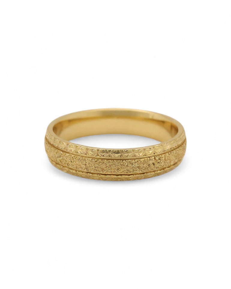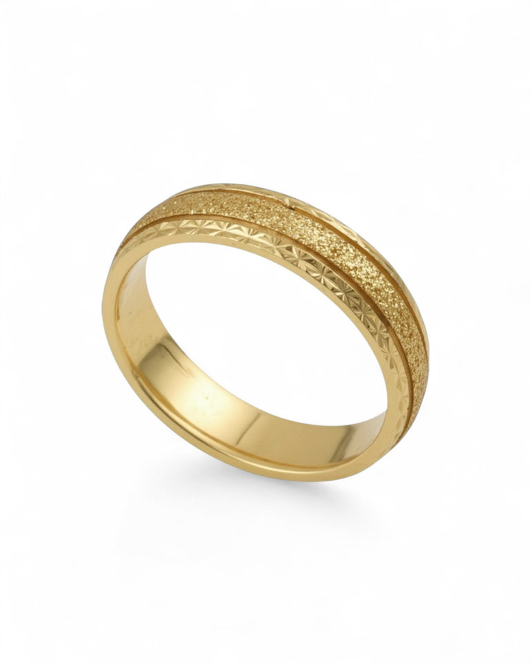 טבעת נישואין אלגנטית עם פס נצנוץ מרכזי בחריטת לייזר, היוצר הברקה עדינה ומרשימה לאורך כל ההיקף. משני צדי הפס מופיעה טקסטורה גאומטרית מעודנת, המוסיפה עומק ואופי ייחודי מבלי להתחרות בזוהר שבמרכז. השילוב בין המרקם הצדדי לבין הנצנוץ מעניק לטבעת מראה מאוזן, מוקפד ויוקרתי — מושלם למי שאוהבת קו קלאסי עם טאצ’ מודרני.
