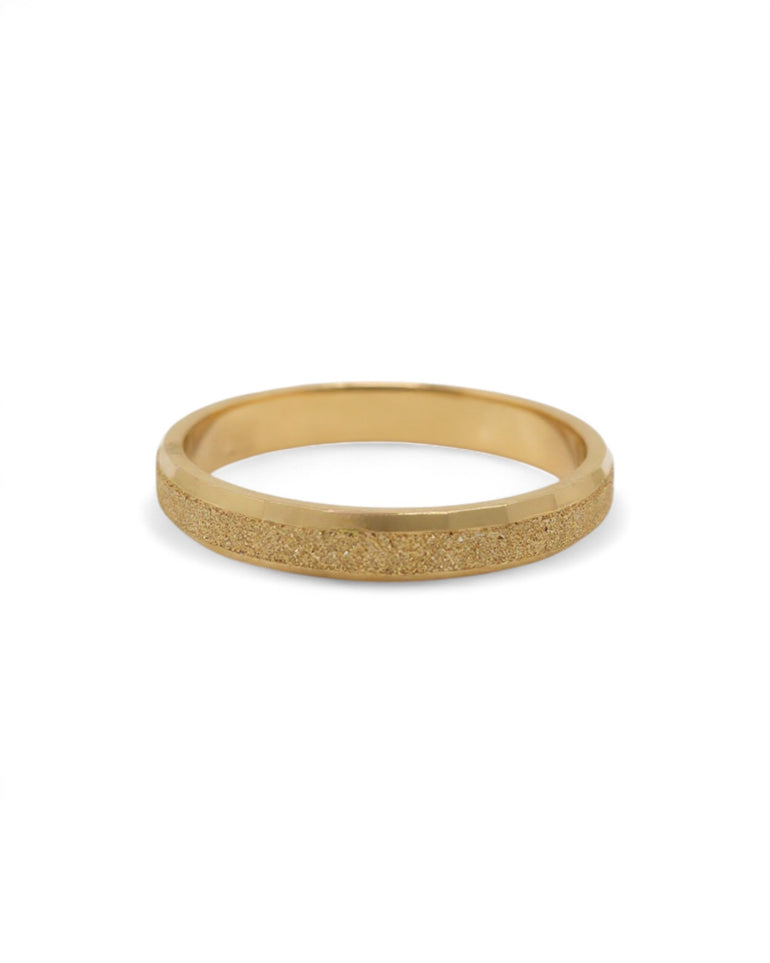 טבעת נישואין אלגנטית בעלת פס מרכזי במרקם נצנוץ ייחודי, המעניק מראה מרשים וזוהר לכל אורך הטבעת. משני הצדדים עוטף את הפס המרכזי קנט עדין בעל פאות קטנות ומלוטשות, שמוסיפות משחק אור מדויק ומדגישות את הקימור הנקי והקלאסי. טבעת נוחה ליומיום ונראית יוקרתית מכל זווית.