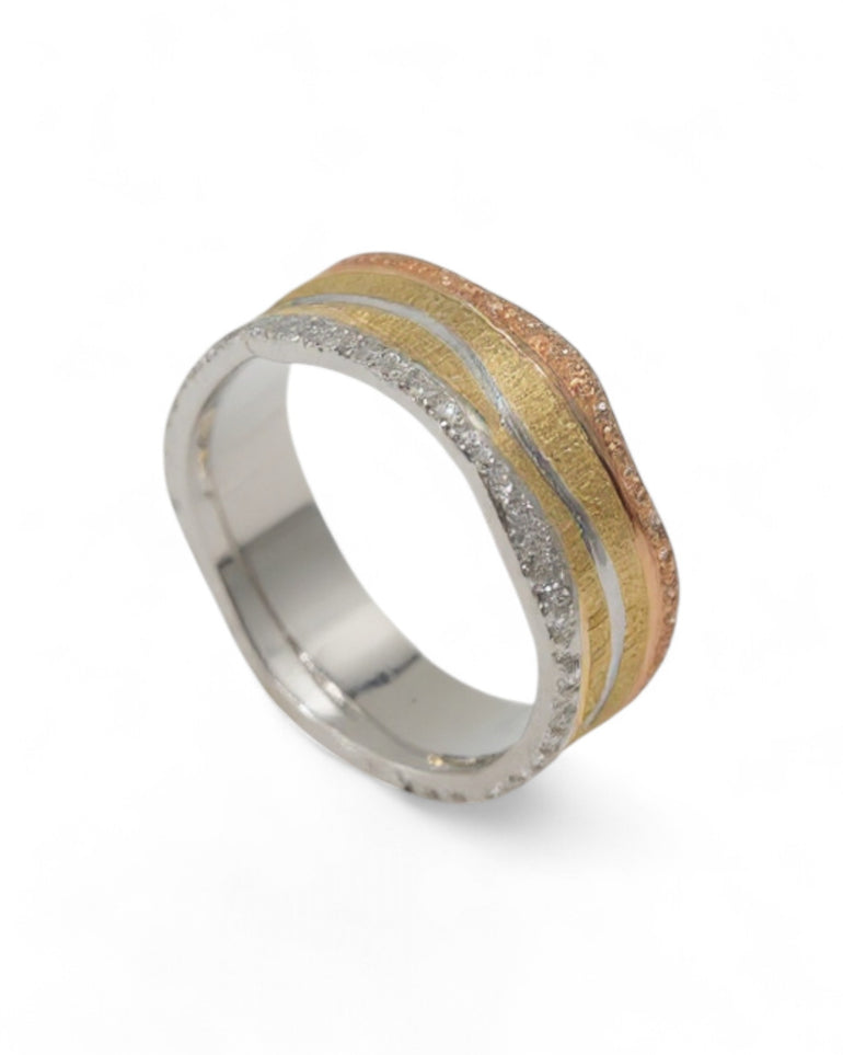טבעת נישואין רחבה ובעלת עיצוב תלת־גווני מיוחד, המשלב זהב לבן, זהב צהוב ורוז־גולד. בחלקה העליון הטבעת מקבלת צורה גלית עדינה, שבתוכה משולבים שלושה פסים במרקמים שונים: פס זהב צהוב בטקסטורת נצנוץ עדינה, פס רוז־גולד בעיטור מחוספס בחריטת לייזר, ופס זהב לבן המעוגל ביניהם ומעניק קו נקי ומעודן. ההיקף החיצוני של הטבעת מעוטר בטקסטורה מנצנצת נוספת, שמדגישה את העומק ואת משחק האור בין הגוונים. התוצאה היא טבעת ייחודית, יוקרתית ובעלת אופי אומנותי.