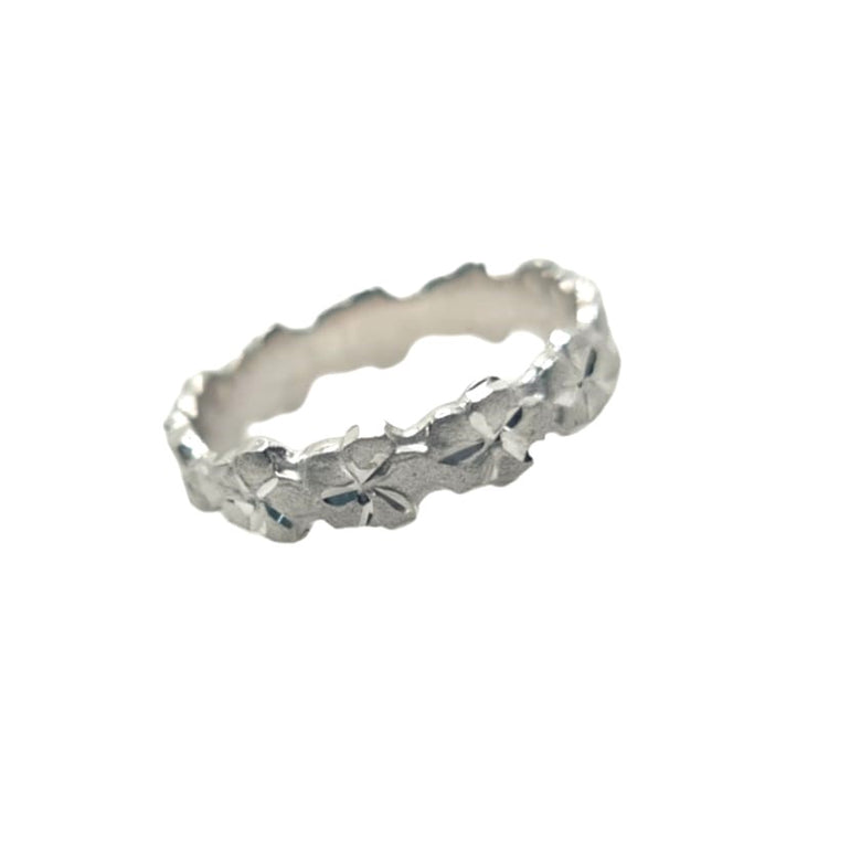 טבעת נישואין בעיצוב אמנותי וטבעי, עם טקסטורת עלים ייחודית בעבודת יד לכל אורכה. פני הטבעת משובצים בחריטת לייזר המדמה משטחי עלים משתלבים, שיוצרים גימור בולט ומרהיב. המבנה הגולש של שולי הטבעת מעניק לה תחושה רכה וזורמת, והעיצוב הלא סימטרי מדגיש את האופי האורגני של הטבעת.
